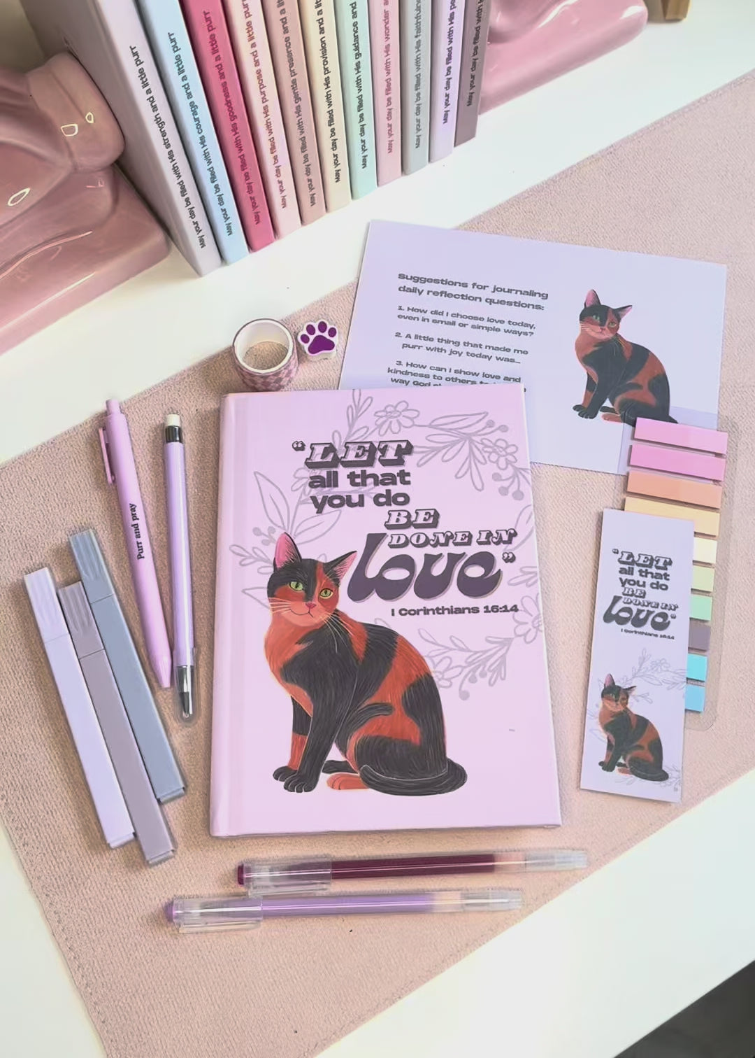 The Violet Haze Gift Set is a coordinated, faith-centered stationery bundle created to bring peace, beauty, and Scripture into your daily routine. This curated set includes an A5 Bible verse journal, a matching pastel stationery kit, and a mini pack of Christian stickers featuring uplifting verses and cat illustrations.